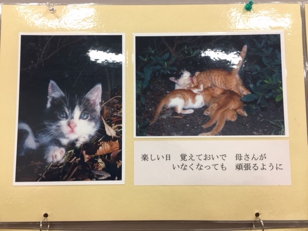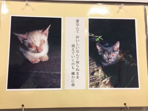 入ってすぐ左側に野良猫の写真とその写真に合わせた川柳が展示してあり、川柳を詠むと胸が締め付けられる思いです。