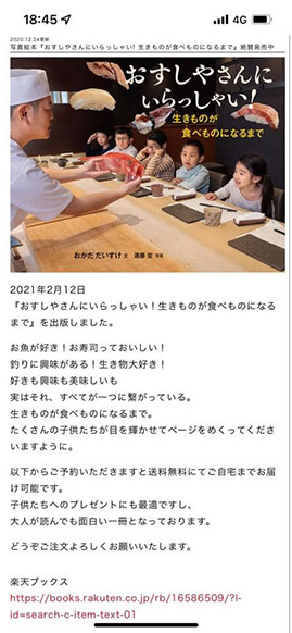 また岡田さんは、昨年2月に岩崎書店より、「おすしやさんにいらっしゃい!~生きものが食べものになるまで~」っちゅう子供向けの写真絵本も発売されちゅうがよ。
