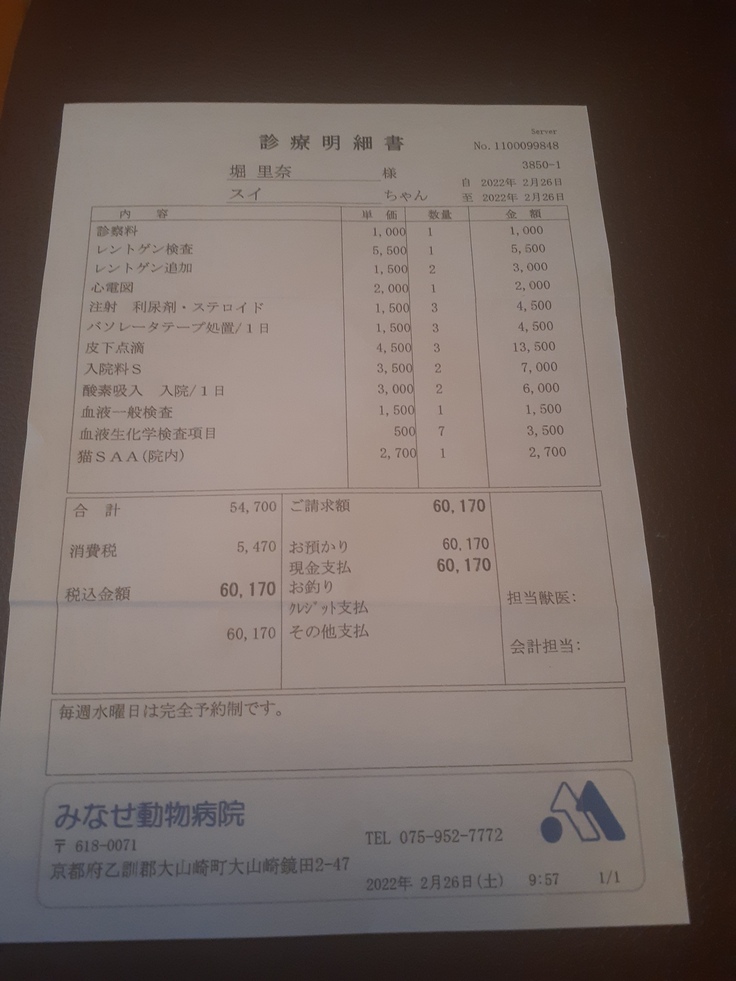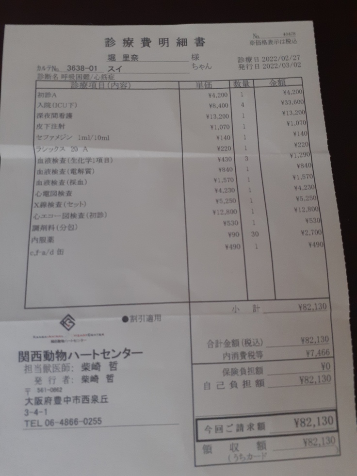 翌日会いに行くと更に弱っており、肺水腫になっているとの事で呼吸が辛そうで、今にもダメになりそうな状態で心臓専門の病院へ行った方が良いとのことで、そのままそちらの病院へ移ることになりました。
