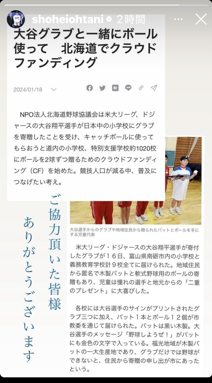 本日、ロサンゼルスドジャースの大谷翔平選手がInstagramのストーリーで、北海道野球協議会のクラウドファンディングのことをとりあげていただきました。