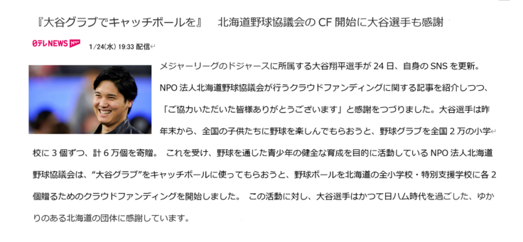 大谷翔平選手が1月24日にインスタグラムで、ボールを配布するためにご協力いただいてる皆さまへ感謝をしています。本日で目標額の40%の60万円に到達しましたが、これからも多くの皆様のご協力をお願い致します。