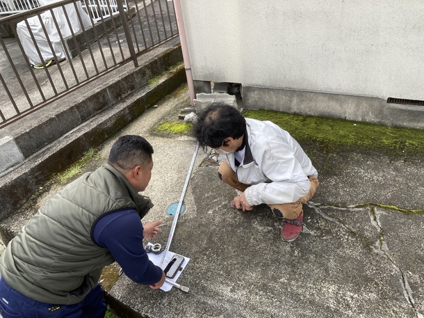 今日は土建屋さんが来て、店舗前に造る守りの屋根の基礎工事の施工前の確認をしました。