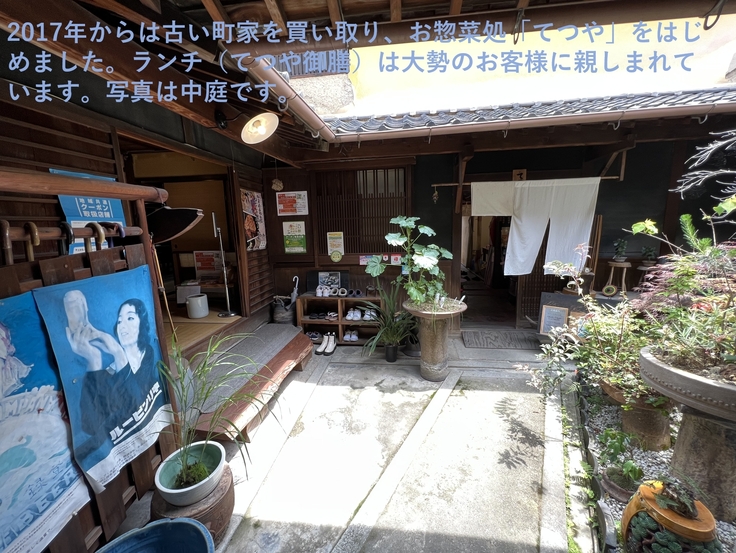 ここでは地産地消の料理の提供のほか、お惣菜やお弁当、生鮮食品や加工食品を販売しており、地域の皆様から大変喜ばれ、県外からも多くのお客様にご来店頂いております。私どもは、この古民家食堂「お惣菜処てつや」を拠点にまちづくり事業を本格化させ、地域の景観整備や、町の賑わいづくりの事業に日々挑戦しております。