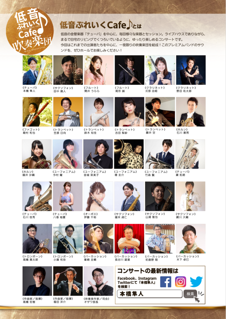 今回のプロジェクトは私が2019年にはじめ、現在も代表で企画している「低音ぶれいくCafe♪」3年間の集大成として、これまでの出演者たちを中心に、一夜限りの吹奏楽団を結成して演奏会を開きたいというものです。