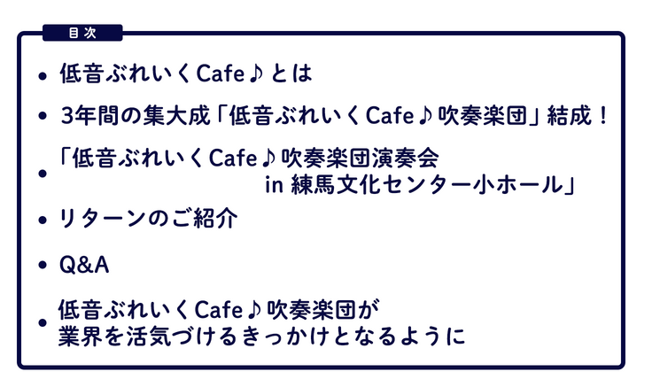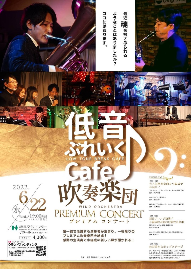 3年間の集大成として。そして今後の吹奏楽業界に対しても開催する意義があると思い、田中靖人さん発起人のもと、当プロジェクト「低音ぶれいくCafe♪吹奏楽団演奏会in練馬文化センター」を立ち上げるに至りました。