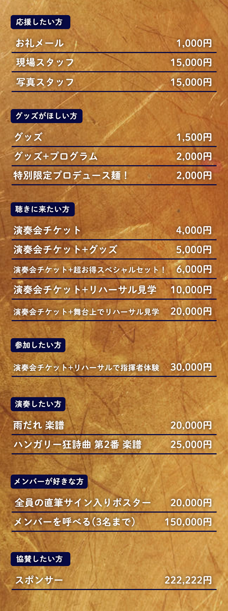 今回のプロジェクトでは、演奏会参加チケットの他、オリジナルグッズや出演メンバーと関われるようなリターンをご用意致しました。