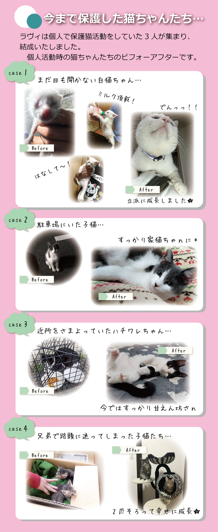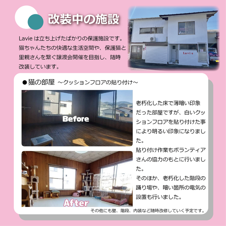 動物愛護団体Lavieは個人ボランティア3人が集まりシェルター(保護施設)を設立し、活動を始めました。現在では猫のお世話をして下さるボランティアさん、シェルターの修繕をして下さるボランティアさん、支援物資を届けて下さるボランティアさんに助けられて活動しております。