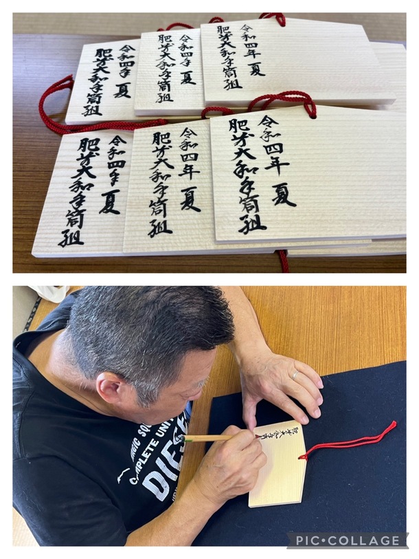 それに下げる絵馬に、一枚一枚手書きで宛名を書きます。