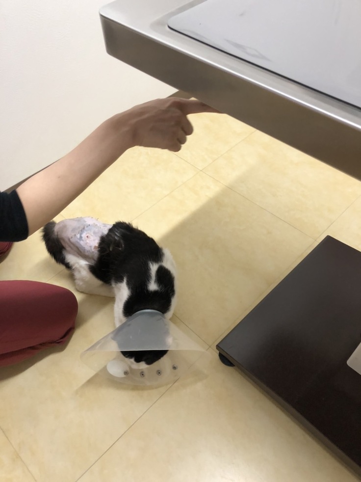 もし赤く腫れたりただれたりしたら、再度受診しないといけないそうです。もう1箇所しっぽ側の傷は自然治癒で良いそうです。手術の傷はカサブタになったり、カサブタが剥がれたりしていて順調に治ってきています!