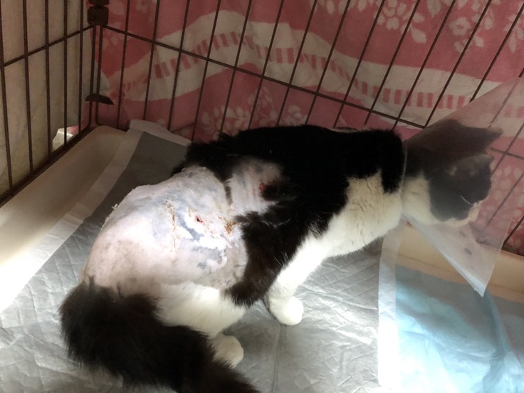 手術のために剃った毛以外に、背中に毛がない箇所があって、事故の際に擦ったキズのようです。その部分が何箇所か脱毛していました。過去の写真を見返しても、目立った脱毛はなかったので、傷が自然に治ったりしていって、毛が抜け始めたようです。今回治療の際、自然にごっそり抜けています。