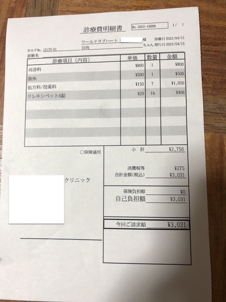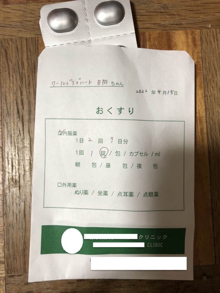 2箇所傷があって、首側の傷は膿がでていたので抗生物質の飲み薬がでました。