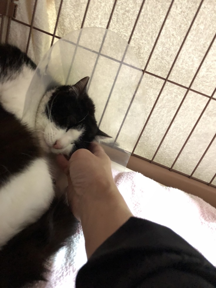 行きの車の中で、ジッとこちらを見てくれていて、話しかけると何度もおめめをそっと閉じてくれて、何か感じてくれているようでした。施設に戻って、ボランティアにチュールをもらって、その勢いで顔を撫でてみたら気持ちよさそうな顔をして撫でさせてくれました。来た頃は表情も固く見えましたが、だんだん優しい顔になっていて、慣れてきてくれているのかなと感じています。日向、もう少し頑張ろうね。