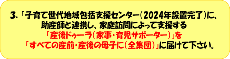 4.「産後ドゥ―ラ」が全出産家庭へ届くよう、行政に政策提言活動をする。
