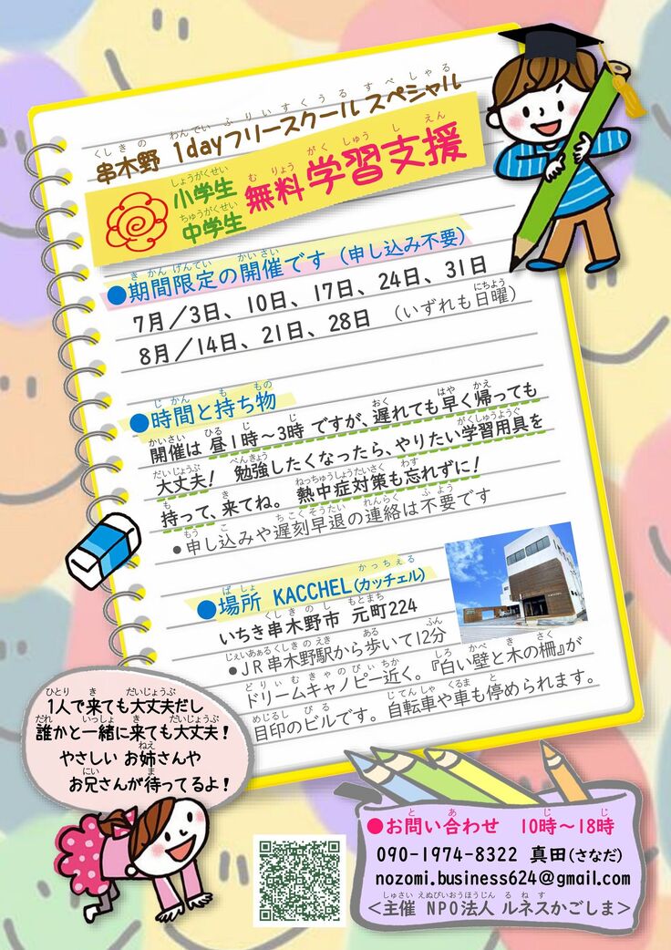 この夏(7~8月)は、いちき串木野市で毎週日曜日に(8月7日だけ「大そうめん大会」開催のためお休み)おこなっていますし、ひだまりカフェに勉強道具を持ってきてもいいですし、別の時間に個別で勉強したいという方は、公共の場所やご自宅にご訪問させていただいて学習をおこなうこともできます。
