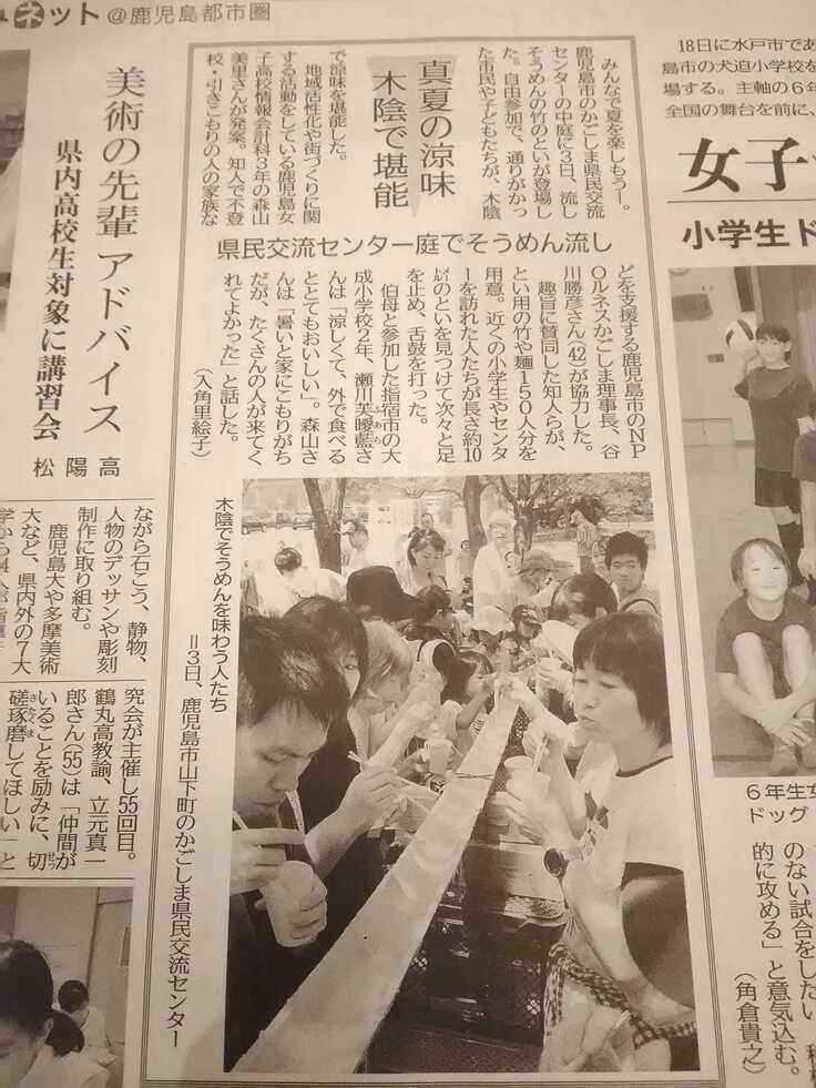 かごしま県民交流センターの広い中庭(県政記念公園)に、4mの竹を設置しまして、兵庫県は播州の「揖保乃糸・特級品(黒帯)」を流し、指宿は唐船峡のつゆでいただく、毎年恒例の企画です(去年は雨予報で中止したら晴れた)。