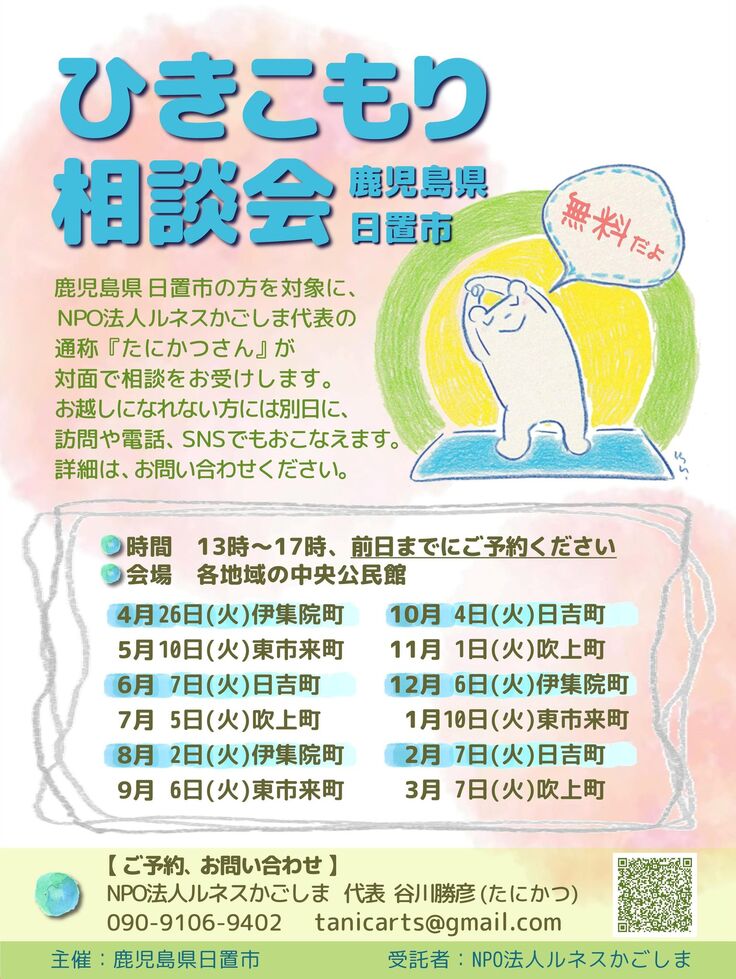 NPO法人ルネスかごしまでは、鹿児島県の日置市において、予算をいただいて、「ひきこもり支援事業」の委託を受けています。