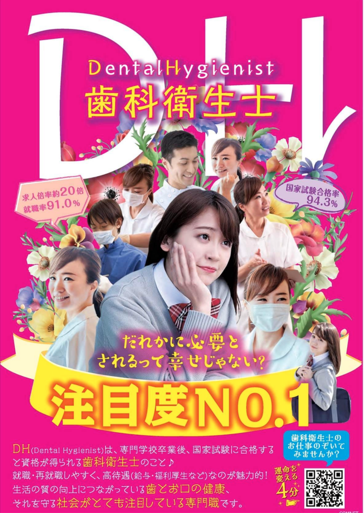 多くの高校生が歯科衛生士に魅力を感じ、歯科衛生士学校への入学者が増え、国民の生活を守る歯科衛生士が溢れることを私たちは願っています。同じように開業医でありながら高校生に歯科衛生士の魅力を伝えてらっしゃる愛知県ご開業の押村憲昭先生のご厚意で先生が作成されたポスターを「ジモクラ」というにいがた高校生進路支援情報誌に載せたいと考えています。このポスターのQRコードには衛生士の魅力を伝える動画が入っています。この動画を見ることで多くの高校生が歯科衛生士という仕事に興味を持ってもらうことができると考えています。新潟市内の高校に配布されるこの情報誌は発行部数25000部、高校生とその保護者が見て歯科衛生士という職業を知ることができるようになると思います。(ポスターは押村憲昭先生より許諾を得て掲載しています)