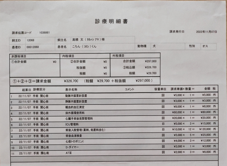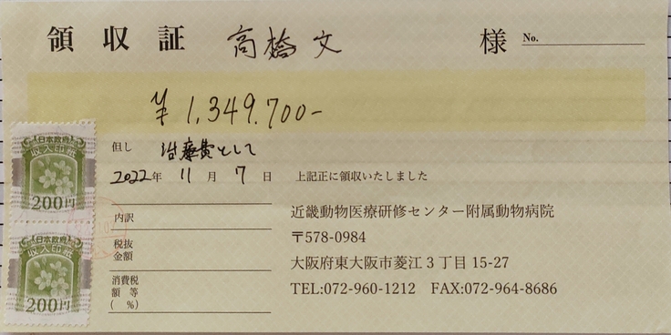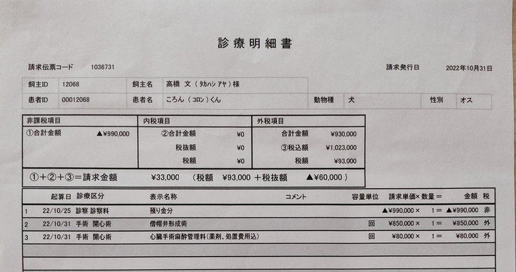 1,105,260円すべてをコロンの手術費に使わせていただきました。