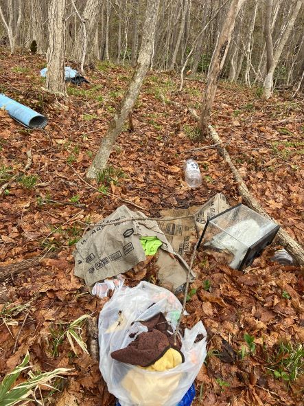 森や湿原周辺での不法投棄や散乱した産業廃棄物
