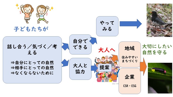 子どもたち自身が創る未来こそが、世界が求める多様な生物と共生できる地球ではないかと考えています。子どもたちが「大切な景色(環境)を見つけ」「守ることを考え」「行動を起こす」ことを支援し、子どもたちが考えた行動が実現する仕組みづくりを行っています。