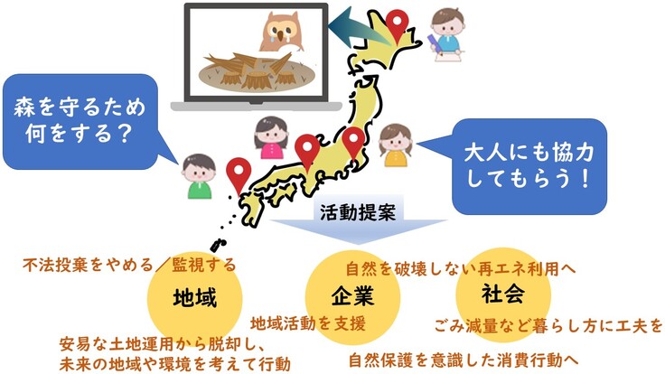 そこで、シマフクロウやクマゲラ、エゾモモンガたちがこれからも生き続ける原生林を守るために、日本中の子どもたちが北海道の森にすむ生きものを守るために行動し、社会を動かし、課題解決を目指すプロジェクトを立ち上げました。
