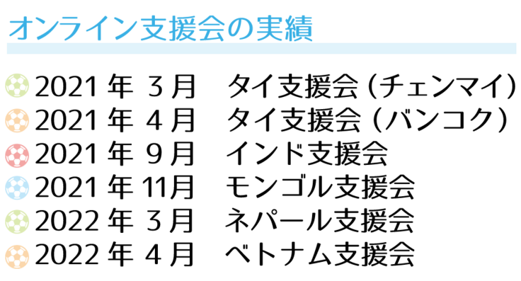 これまでの実績2020年、この活動に賛同した元サッカー選手や若手経営者の集まり、NPO法人「ボールひとつが繋ぐ縁」を設立いたしました。