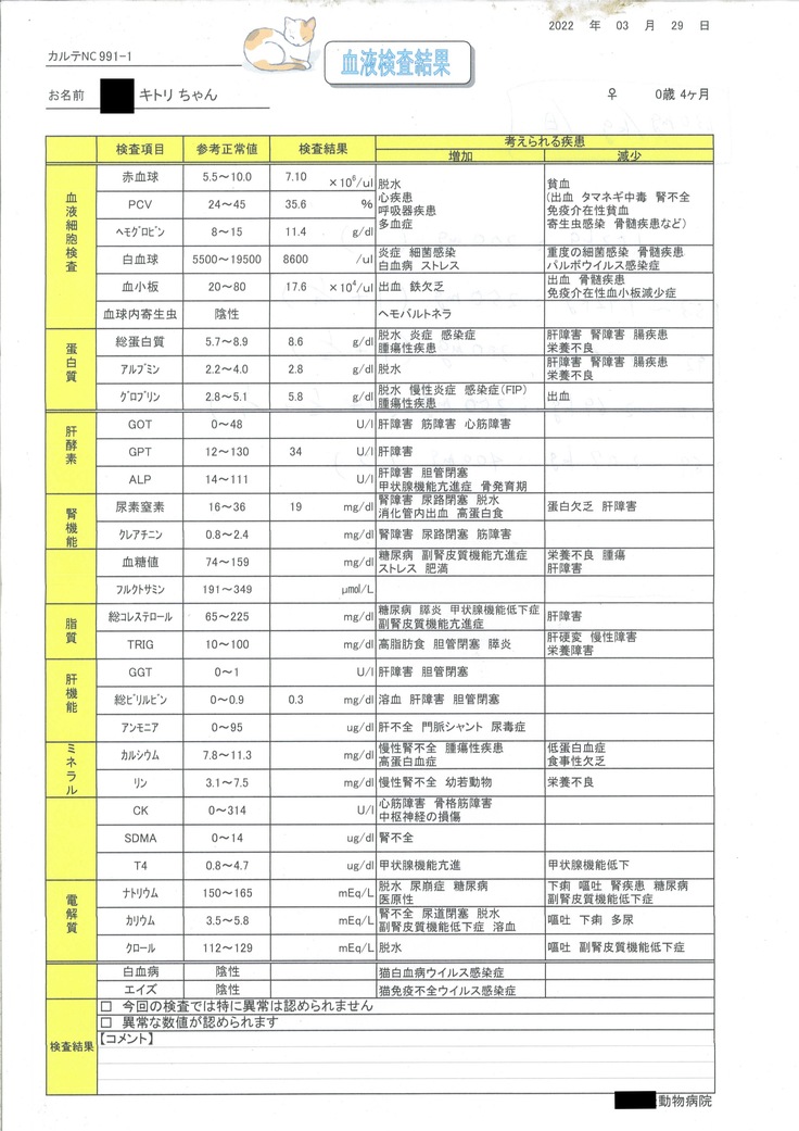 未承認薬の1週間の投与を経て、貧血の改善、黄疸の減少等の改善がみられ、また体重が増えたこと(3/22 1.2キロ→3/29 1.4キロ)から投薬の効果が出てきていることが判明しました。