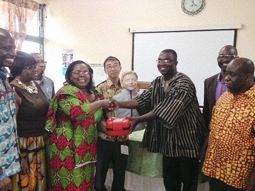 昨年6月、皆さまのご支援を得てAED1台とトレーナー、胸骨圧迫による心肺蘇生法や人工呼吸を練習するためのマネキンを、ガーナの政府機関で日本の厚生労働省に匹敵する「ガーナヘルスサービス」に寄贈しました。