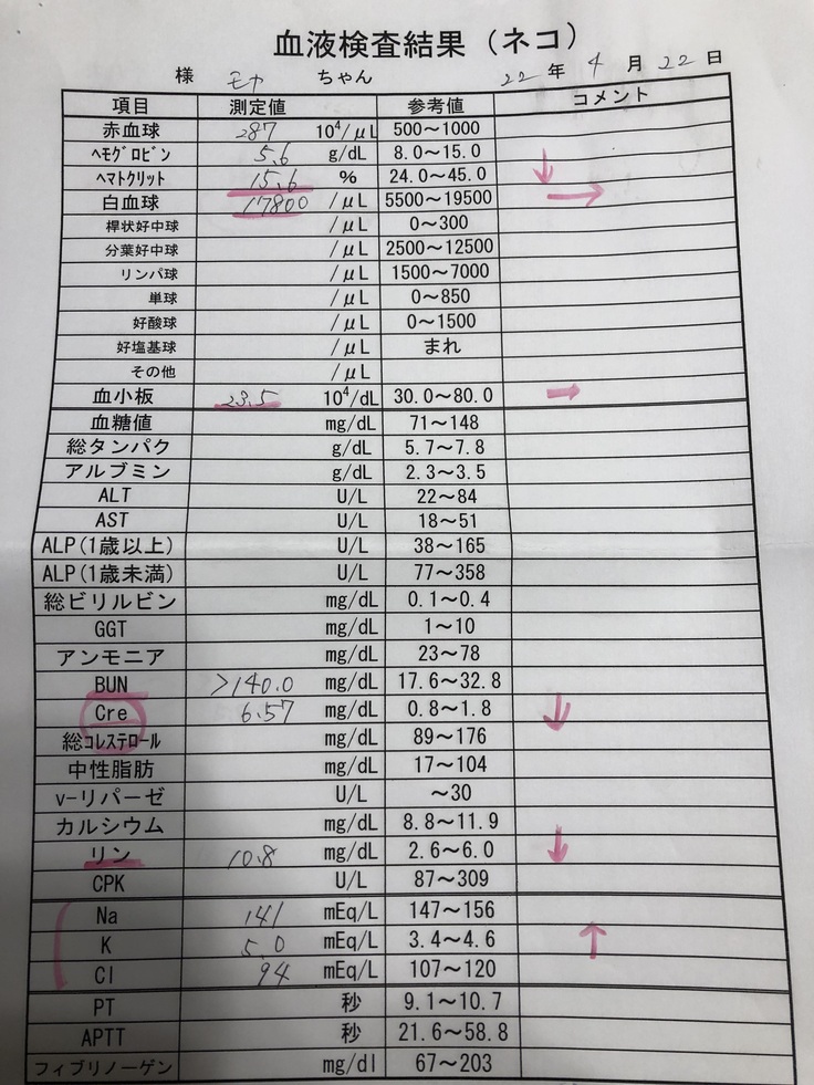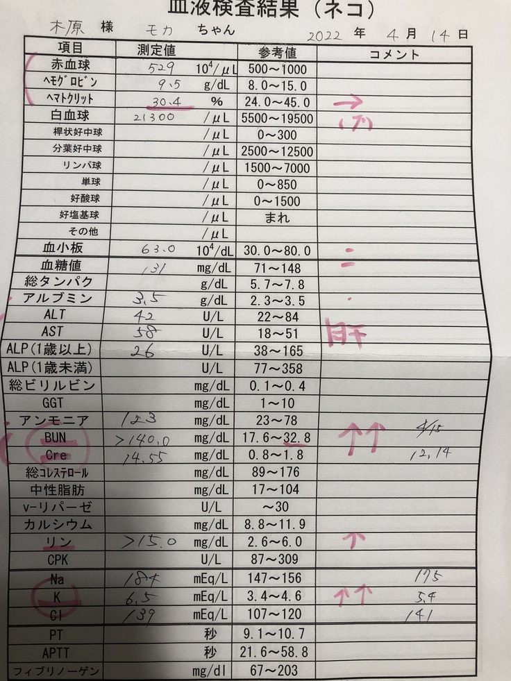 4/12から地元の動物病院に入院し、血液検査の結果はCREは14.6mg/dl、BUNは140mg/dl以上でした。