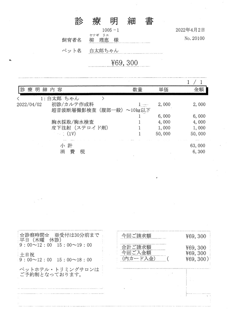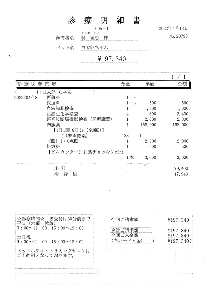 現在、入院代、薬代(836.000円)、検査代他を含め支払った医療費 合計 1.030.000円 投薬を開始して、見違えるように体調が良くなっています。 このまま84日間投薬を継続させてあげたいです。