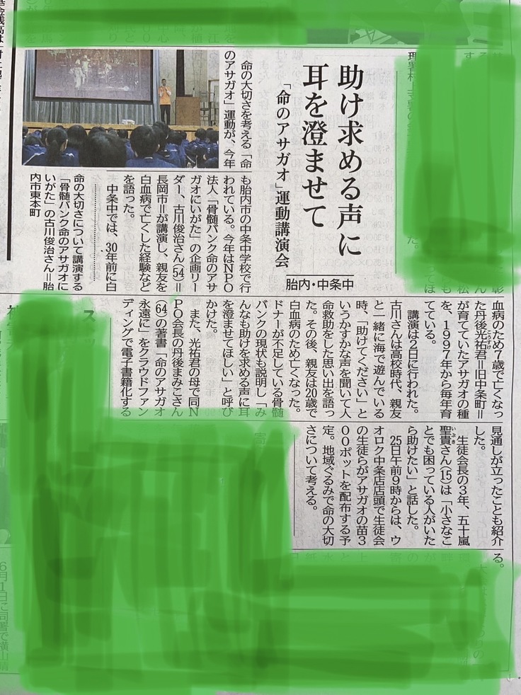 ① ドナー登録は18歳からですが、前段階からの啓発が大切だと考えます。
