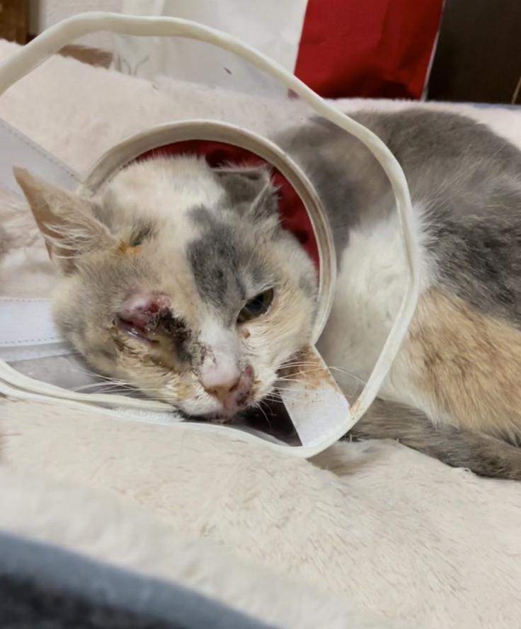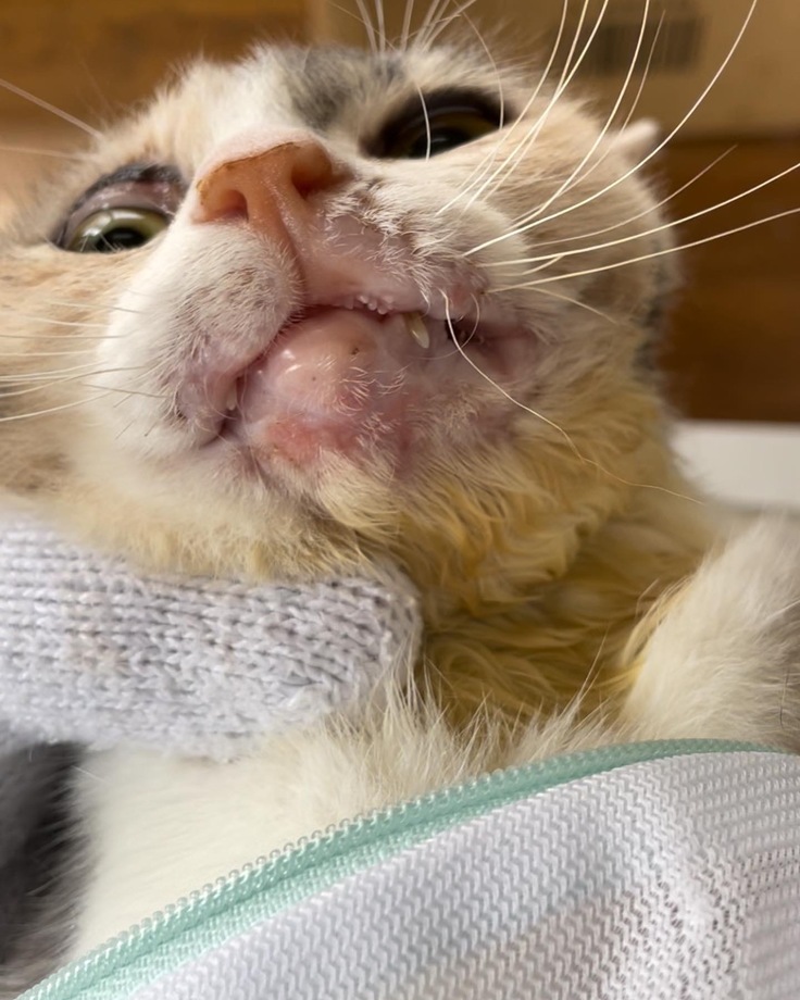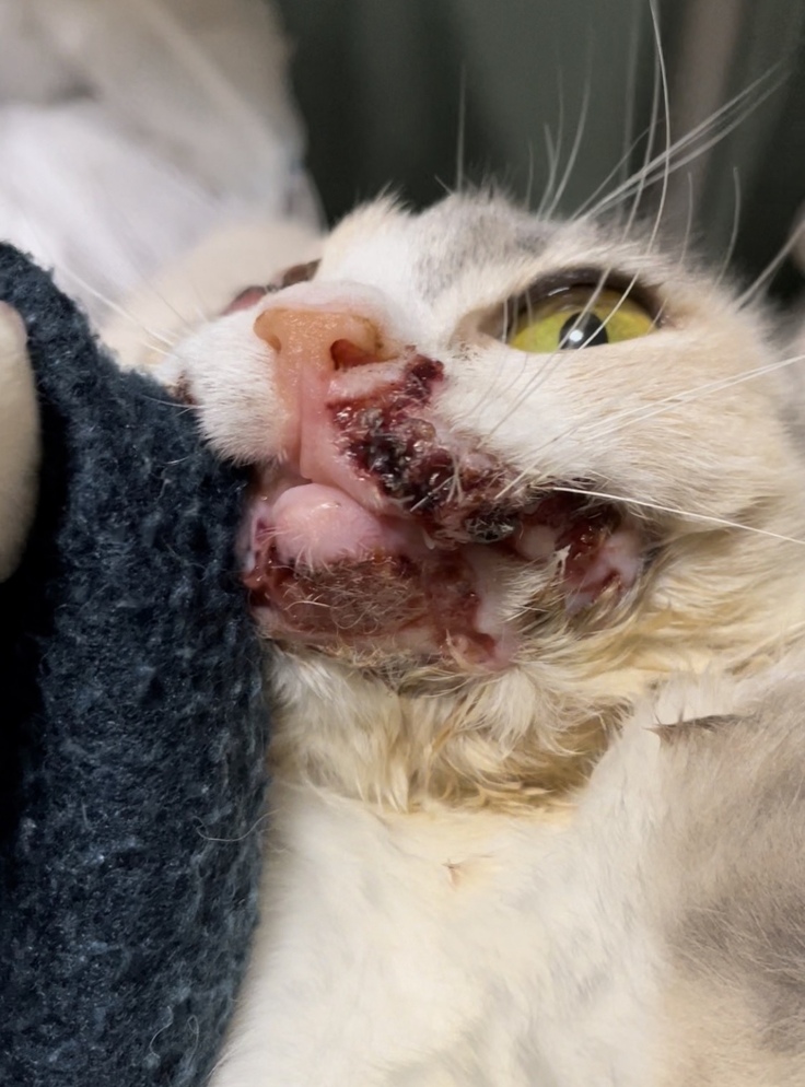 しかし、その後もヘモバルトネラによるヘモプラズマ・猫ヘルペス感染症と次々に感染し、さらにお顔に膿が溜まってしまいました。