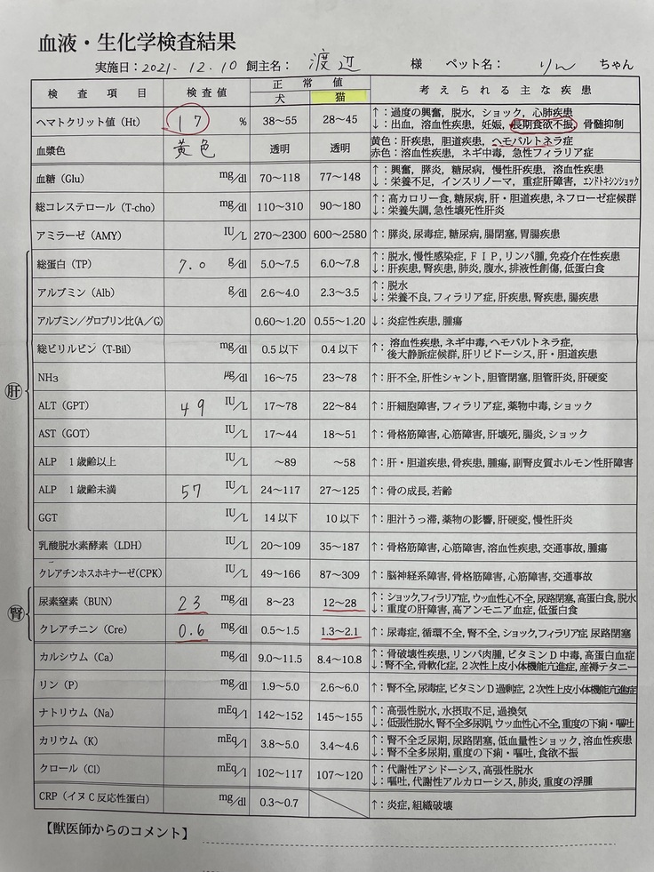 分かりにくいですが、1番上のヘマトクリット値(正常値28〜45%)が2021年12月時点では17%でしたが、41%に改善しました。