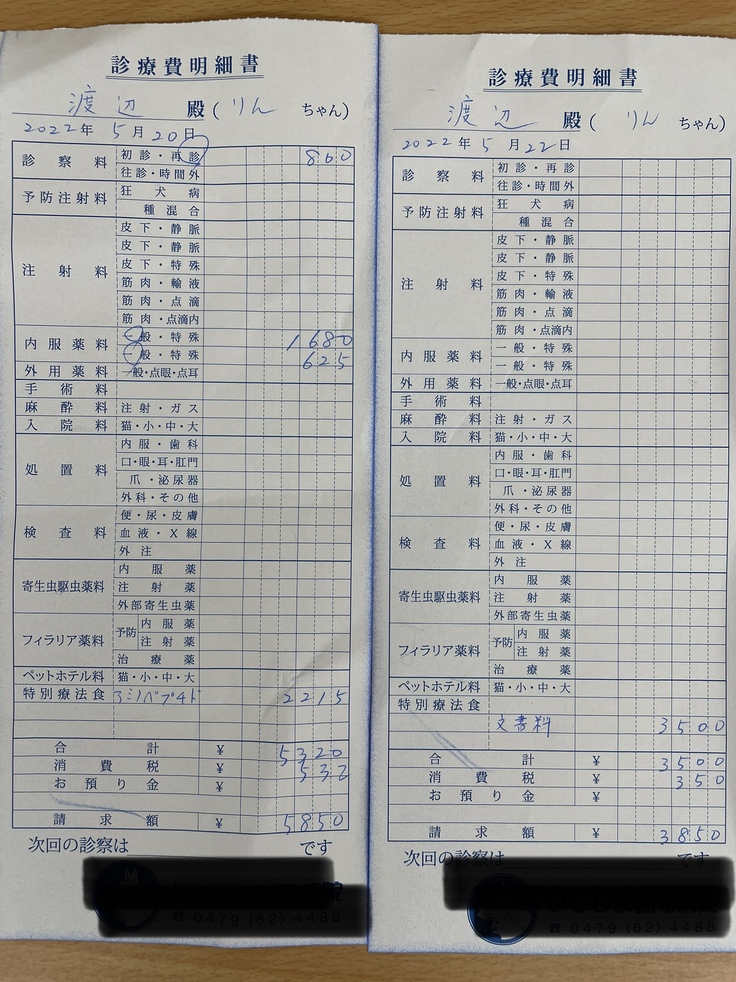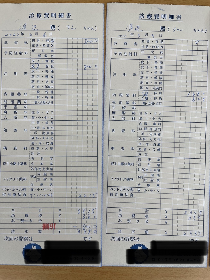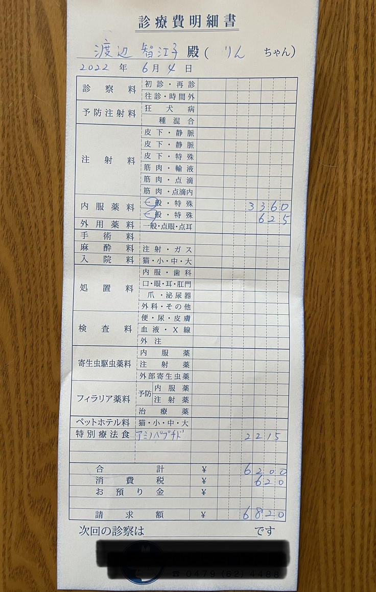 何かを発症するたびに、お薬や治療が変わりますので、今後の治療費については、はっきりとした数字は算出できませんが、現在は抗生剤と、抗生剤の長期使用により不足してしまうビタミンKを補うためのケイツーシロップが処方されております。