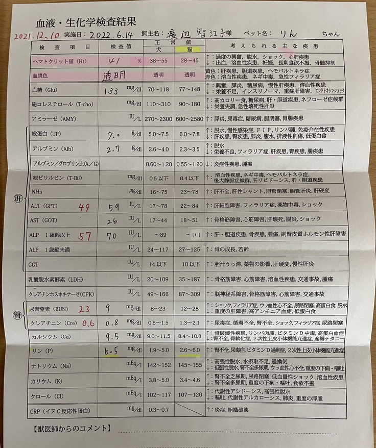 12月の段階の黄色はヘモバルトネラ症の感染を示していたそうですが、今回の検査でヘモバルトネラ症は寛解したと見て良いそうです。