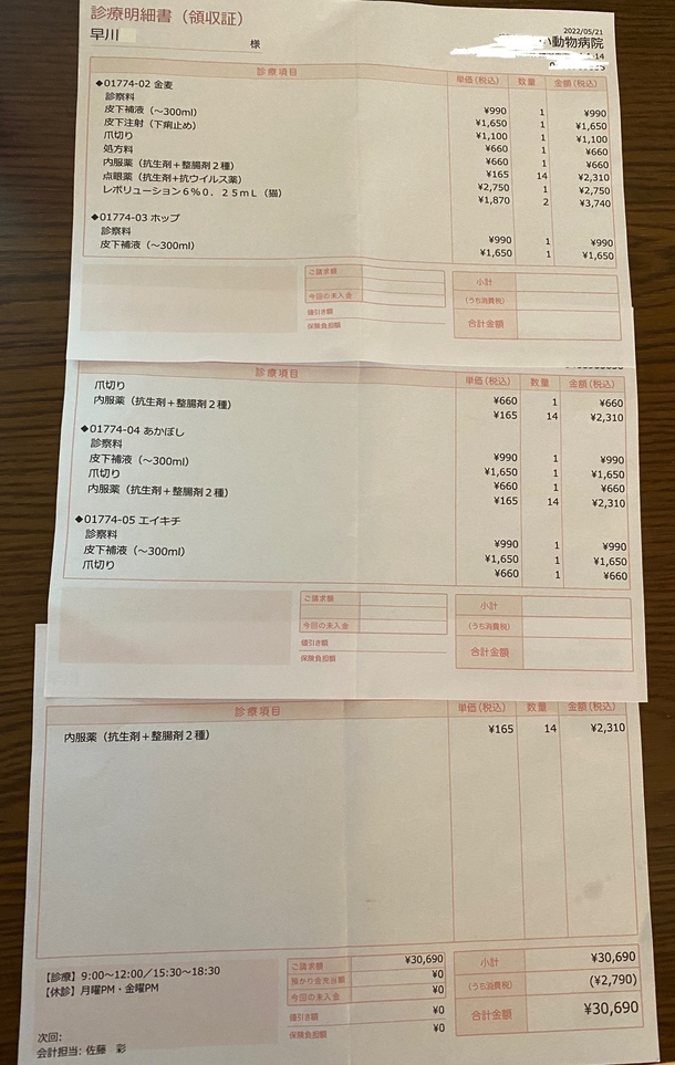 4匹+自宅の猫1匹のお世話は収入上厳しいため、治療を終えてから保護猫カフェの協力を元に里親を探します。