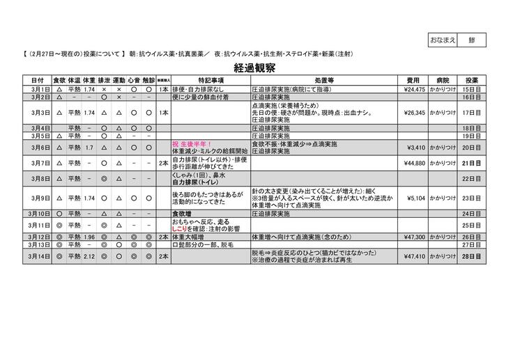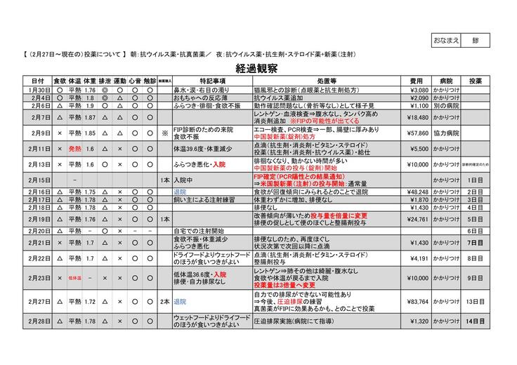 FIP発覚までの症状や処置内容、発覚後(~3月14日 投与28日目)の経過をご報告いたします。
