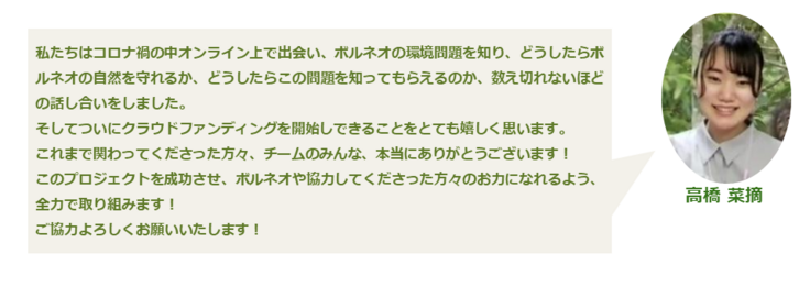 また、クラウドファンディングを行うこと自体が、より多くの人に私たちの想いやボルネオの現状を伝えるきっかけになるのではないかと考えたのも、決断を後押しした理由の一つです。