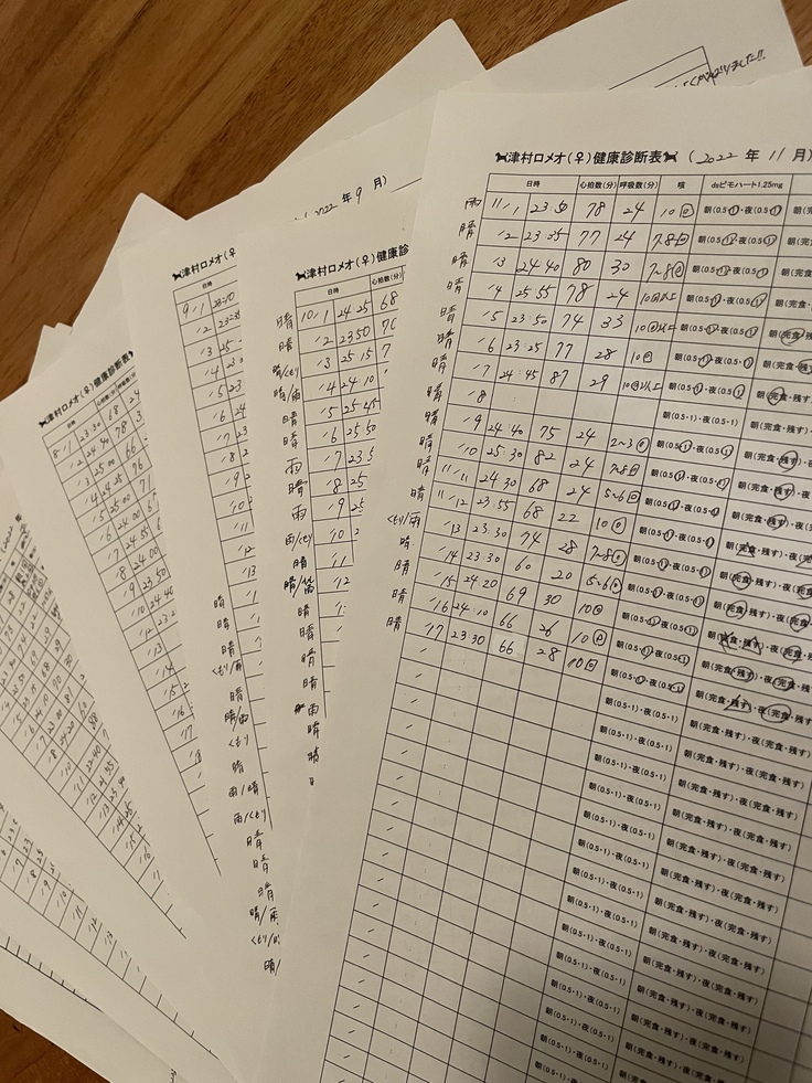 飼い主ができることとして毎晩、聴診器で心拍数と呼吸数を数えることが日課となりました。