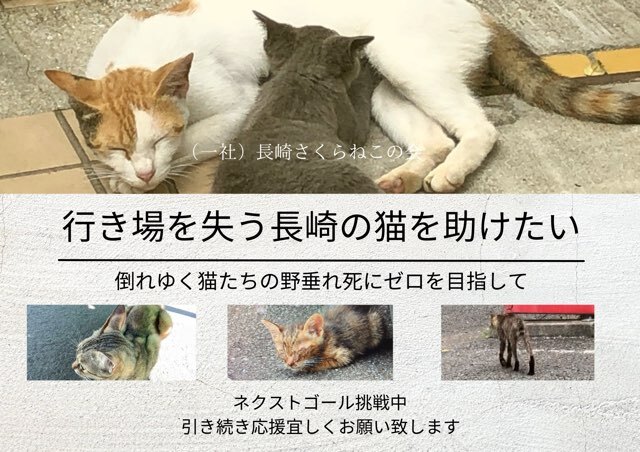 長崎の猫たちに思いを寄せて下さる全国の皆さま、ご協力いただいている皆さまへこの場をお借りして、心より感謝申し上げます。 クラウドファンディングへのご支援のおかげでこれから救出できる猫たちが増えました。