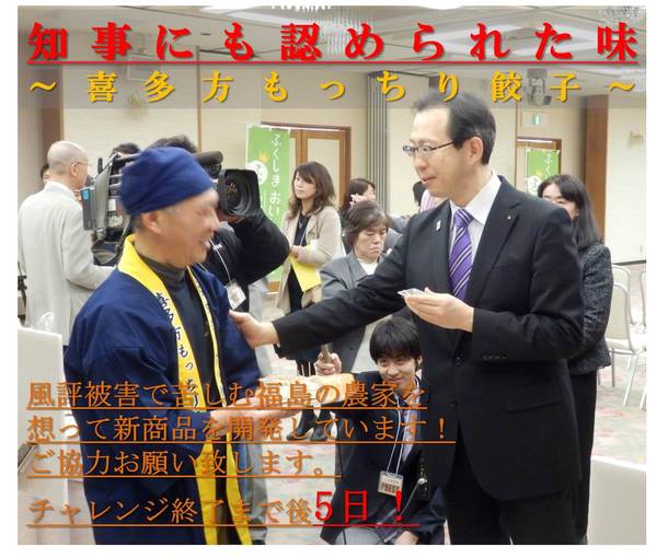 喜多方もっちり餃子は福島県が主催するふくしまおいしい大賞優秀賞受賞し、H27年3月17日 福島市の杉妻会館で表彰式が開催されました。その時、内堀県知事に喜多方もっちり餃子を食べてもらいました。