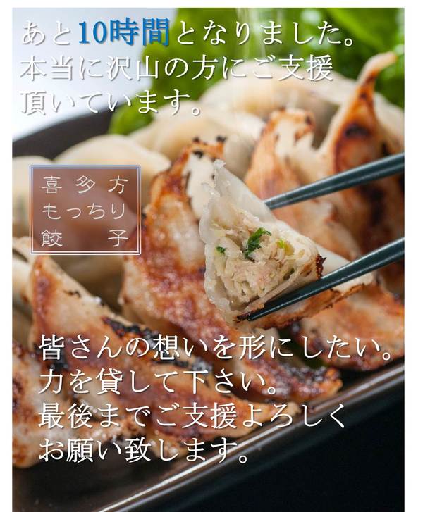 達成しましたら、私たちの少しばかりの御礼として喜多方もっちり餃子10個を皆様へプレゼントいたします。
