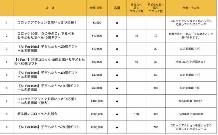※本プロジェクトは、期日までに集まった支援総額に応じて、実行内容の規模を決定します。例えば、期日までに目標金額の50%(30万円)が集まった場合には、1000個分のコロッケを児童養護施設へ寄贈します。
