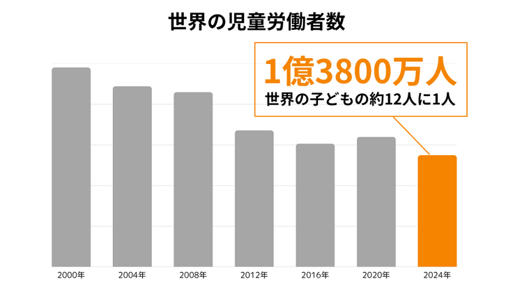 2000年以降、児童労働者数は2億4,600万人から1億3,800万人へとほぼ半減しましたが、この減少ペースでは不十分で、「2025年までにあらゆる児童労働を撤廃する」というSDGs目標8.7は残念ながら達成されない見込みです。