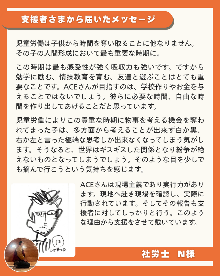 谷川さんは、ACEの活動に賛同してくださり、毎月の寄付で活動を支える「子どもの権利サポーター」として長年ご支援してくださいました。