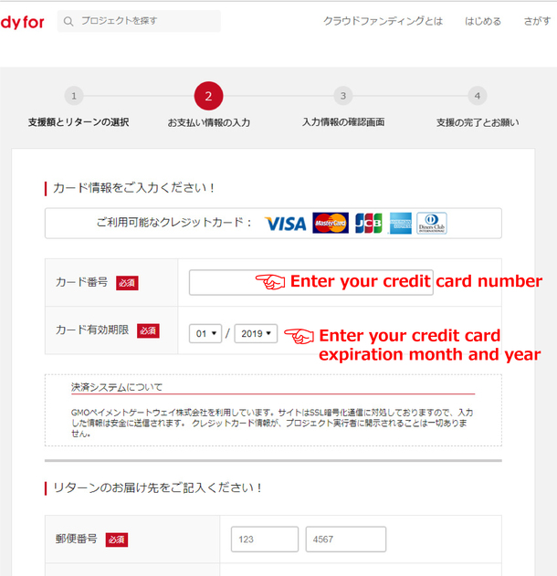 After you enter your credit card information, please scroll down the page and reach to the interface below. In this section, please enter your address so that the project members can send you “thank you item” to you.