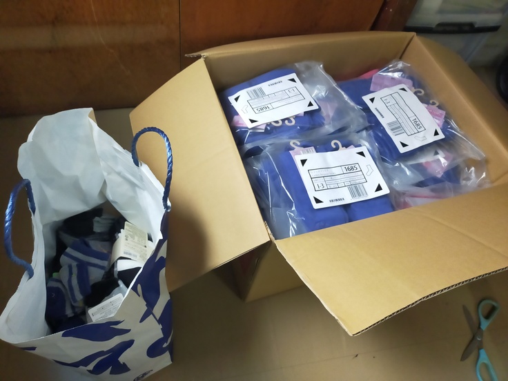 靴下が216足揃ったので、チョコレートと一緒にスーツケースに詰めてみました。後は文明堂のカステラ巻を出発前に詰め込みます。