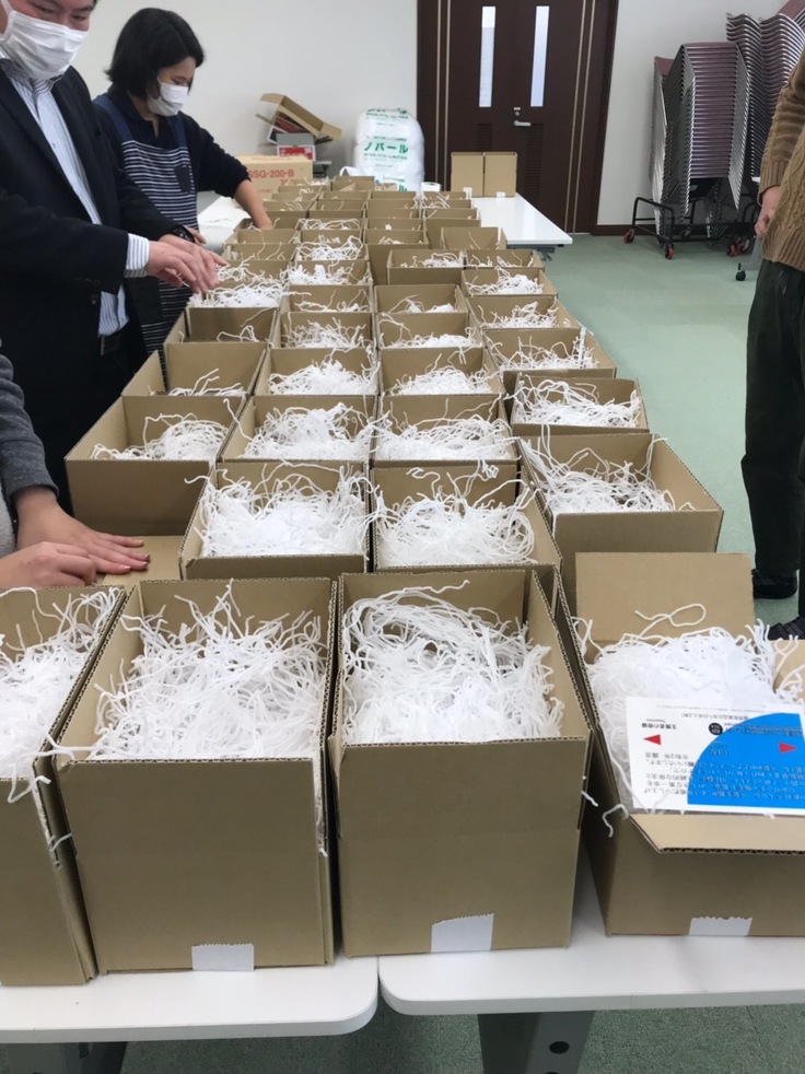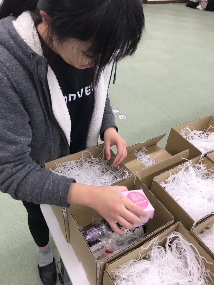 学生で段ボールの準備を行い、クッション材を頂いて流れ作業で順番に詰めて