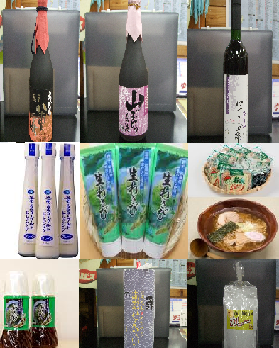 (左から、八重桜大吟醸・山ぶどう原液 ・山ぶどうワイン宇霊羅・岩泉ヨーグルトドレッシング・ねり山葵・どんぐりラーメン3食スープ付・わさびドレッシング・南部せんべい・短角牛レトルトカレー3食です。)