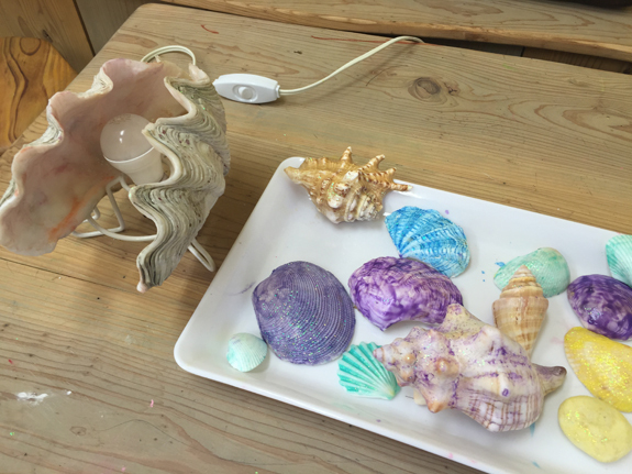 娘のアイディアで100円ショップのラメ入り絵の具で色付けしたら、POPな感じの貝殻になりました!